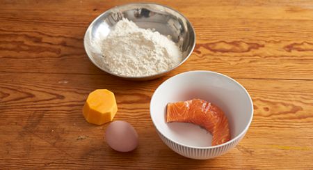 2. Flake the salmon into smaller pieces, then, in a blender, combine all the ingredients until the mix resembles a dough.