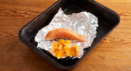 1. Preheat the oven to 200°C/180°C fan, then cook the salmon for 30 minutes. At the same time, dice the pumpkin into small pieces and cook in the oven for about 20 minutes, until soft. When cooked, remove both from heat, but leave the oven on.