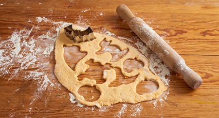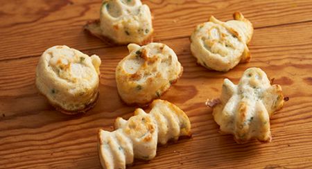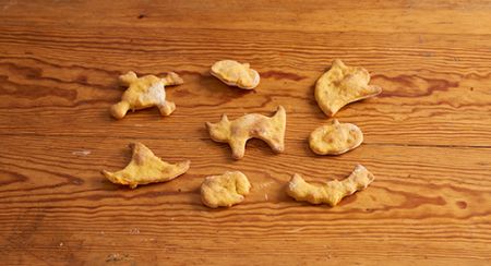 3. Dust a flat surface with flour and roll out the dough mix until about 1cm thick. Use small, Halloween-themed cookie cutters (we love bats, witches’ hats and pumpkins) to cut out biscuit shapes.