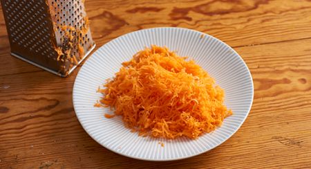 1. Preheat the oven to 200°C/180°C fan. Meanwhile, peel and wash the carrot, then finely grate.