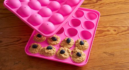 4. Place the balls into the holes in the cake pop tray. Using your little finger, gently make a small indent into the top centre point of each ball. Carefully slice the blueberries in half, then place a half into the indent of each cake ball.