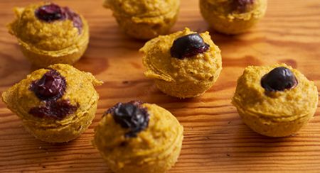 Cake pops are a great way to give your cat a treat without it being too large in size. For a spooky touch, the dark blueberry centre helps the cakes resemble a ghoulish eyeball!