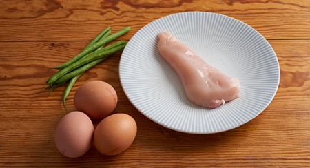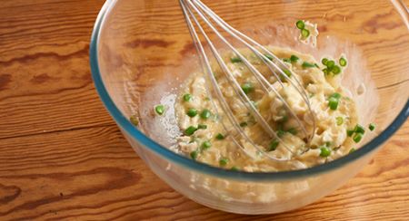 3. Whisk the eggs in a bowl. When the beans and chicken are cool enough, slice them into small pieces and add to the egg. Stir well.