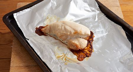 1. Cook the chicken breast at 200°C/180°C fan for around 25 minutes until done. Remove and leave to cool.